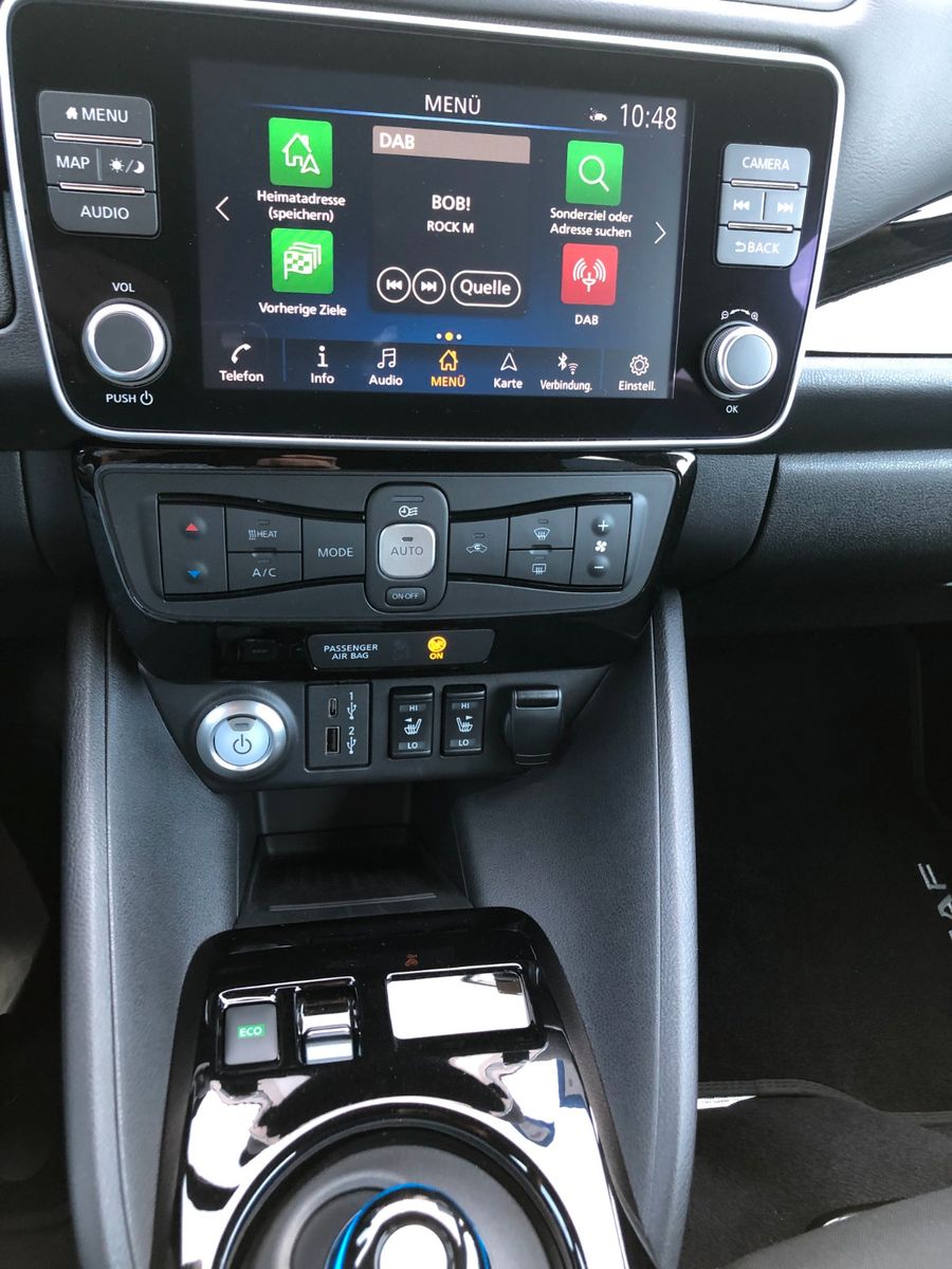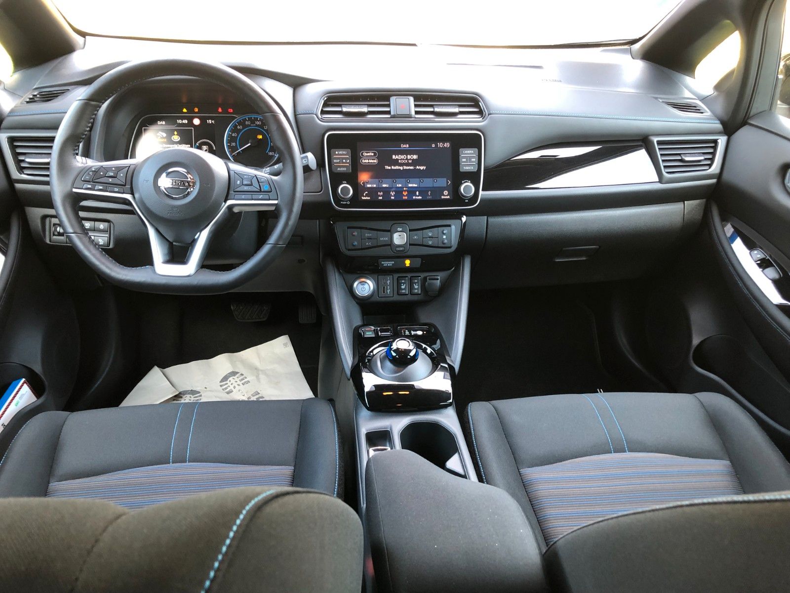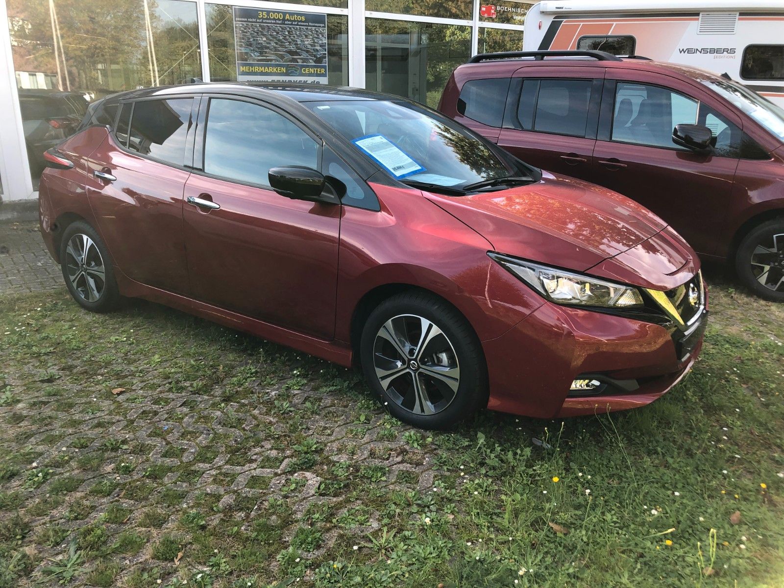 3. Bremsleuchte, Airbag Beifahrerseite, Airbag Fahrerseite, Akustischer Umfeldschutz (Außensound), Ambiente-Beleuchtung, Around View Monitor (360° Umgebungsansicht), Audiobedienung am Lenkrad, Ausstattungs-Paket: Nissan Connect EV, Autom. Begleitfunktion der Beleuchtung (Follow me home), Automatische Fahrlichtschaltung, Außenspiegel elektr. anklappbar, Außenspiegel elektr. verstellbar, Außenspiegel Wagenfarbe, Außentemperaturanzeige, B-Säulen schwarz, Blinkleuchte in Außenspiegel integriert, Bluetooth-Schnittstelle, Dachantenne im Haifischflossen-Design, Elektr. Bremskraftverteilung (EBD), Elektromotor 110 kW (cont. 90 kW), Fahrassistenz-System: aktiver Spurhalteassistent, mit korrigierendem Bremseingriff, Fahrassistenz-System: Autonomer Notbrems-Assistent, Fahrassistenz-System: Berganfahr-Assistent, Fahrassistenz-System: Fernlichtassistent, Fahrassistenz-System: Park-Assistent mit 360° Bewegungssensoren, Fahrassistenz-System: Querverkehrs-Assistent Heck (Rear Cross Traffic Alert, RCTA), Fahrassistenz-System: Spurwechselassistent, Fahrassistenz-System: Totwinkel-Assistent, Fahrassistenz-System: Verkehrszeichenerkennung, Fahrer-Informations-System (FIS) mit Farbdisplay, Fensterheber elektrisch vorn + hinten, Frontscheibe Verbundglas, Getränkehalter hinten, Getränkehalter in Mittelkonsole, Getränkehalter vorn, Gurtstraffer, Handschuhfach beleuchtet, Heckleuchten LED, Heckscheibe heizbar, HV-Batterie 40 kWh, Innenspiegel mit Abblendautomatik, Isofix-Aufnahmen für Kindersitz, Karosserie: 5-türig, Klimaautomatik, Kofferraumabdeckung, Kopf-Airbag-System, Kopfstützen vorn und hinten verstellbar, Ladekabel mit Schukostecker (Mode 2), Ladekabel mit Typ 2-Stecker (Mode 3), Ladevorrichtung Wechselstrom (bis 6,6 kW), Lenksäule (Lenkrad) höhenverstellbar, LM-Felgen, Nebelschlussleuchte, Parkbremse elektrisch, Pedalerie elektr. einstellbar, Pro Pilot-Paket, Reifendruck-Kontrollsystem, Rücksitz geteilt/klappbar, Schnellladevorrichtung, Seitenairbag, Sitz vorn links höhenverstellbar, Sitzbezug / Polsterung: Stoff, Smartphone Schnittstelle (Apple CarPlay & Android Auto), Sonnenblenden mit Spiegel (beleuchtet), Start-Stop-Knopf, Steckdose (12V-Anschluß) in Mittelkonsole, Türgriffe außen verchromt, Verglasung hinten abgedunkelt, Wärmepumpe zur Reichweitenoptimierung, Wärmeschutzverglasung mit UV-Schutz